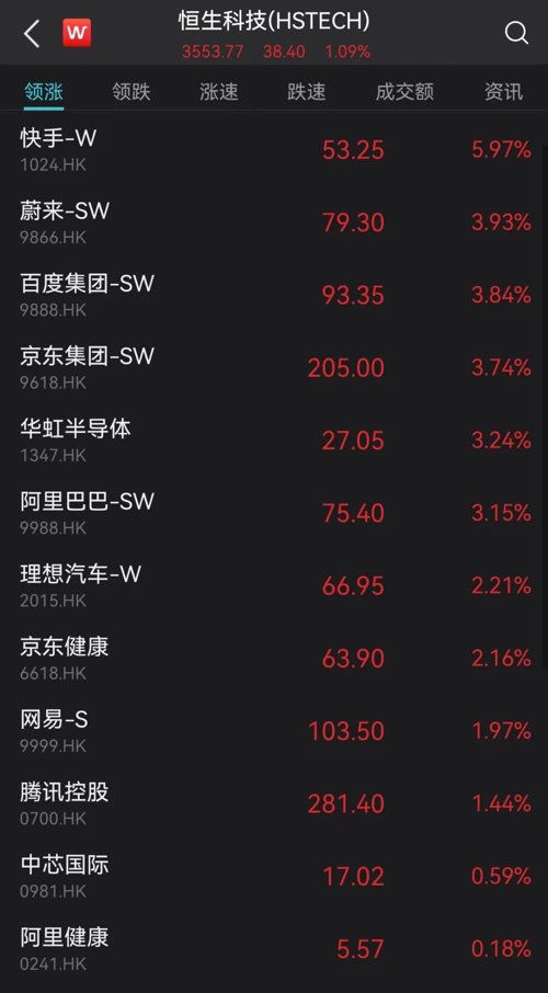 在阿里巴巴的带动下,恒生科技指数也由绿翻红,一度大涨超2%,快手、京东等跟涨。
