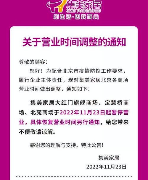 集美家居微信公众号发布营业时间调整通知,集美家居大红门旗舰商场、定慧桥商场、北苑商场于11月23日起暂停营业,具体恢复营业时间另行通知。