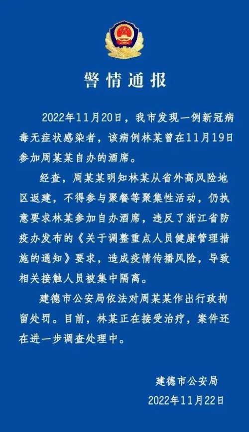建德市公安局11月22日晚通报,该市20日发现一例无症状感染者,该病例林某19日曾参加周某某自办的酒席。周某某明知林某从省外高风险地区返回、按规定不得参与聚餐等聚集性活动,仍执意要求林某参加自办酒席,造成疫情传播风险,导致相关接触人员被集中隔离,已依法对周某某作出行政拘留处罚。