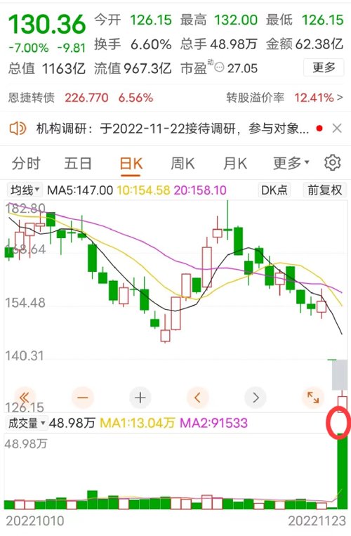 当天,公司紧急召开投资者电话会议,不乏高盛、红杉、中金、易方达等国内外顶级机构参会,不过第二天也就是11月23日,公司股价继续暴跌,盘中数度跌停,收盘跌幅也达7%,而成交放出天量居两市第一,60多亿资金疯狂出逃。