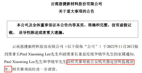 11月21日收盘后,恩捷股份突然公告,于2022年11月20日接到董事长PaulXiaomingLee(即“李晓明”,已入籍美国)和副董事长兼总经理李晓华的家属通知,PaulXiaomingLee和李晓华因相关事项被公安机关指定居所监视居住。相关事项尚待进一步调查。