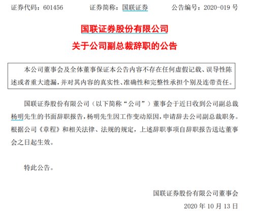 2020年10月,国联证券发布公告称,其董事会收到副总裁杨明的书面辞职报告,杨明因工作变动原因,申请辞去公司副总裁职务。作为分管自营的80后副总裁,正值事业上升期的杨明因“工作调动”而辞职,曾引起多方猜测。