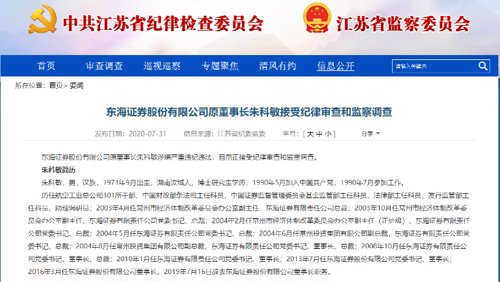 2019年7月,东海证券公告称,其前任董事长朱科敏递交辞职报告。同期东海证券接到江苏省公安厅电话通知,告知朱科敏处于配合调查阶段。2020年7月,江苏省纪委监委官网发布消息称,朱科敏涉嫌严重违纪违法,接受纪律审查和监察调查。