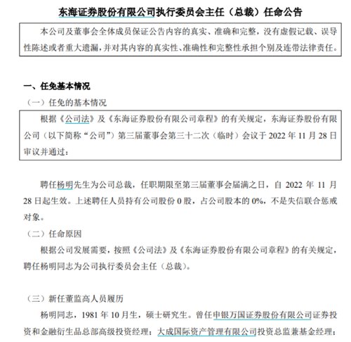 与此同时,东海证券公布了新任总裁的情况:“80后”杨明空降东海证券,出任执行委员会主任(总裁)。从履历上看,杨明此前具有丰富的金融从业经验,且曾在上市券商国联证券处担任副总裁多年。