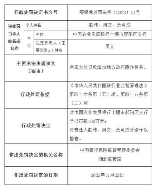 同日,鄂银保监罚决字〔2022〕41号行政处罚决定书显示,中国农业发展银行十堰市郧阳区支行因违规发放贷款增加地方政府隐性债务,银保监会湖北监管局决定对其罚款100万元,对三位责任人予以警告。