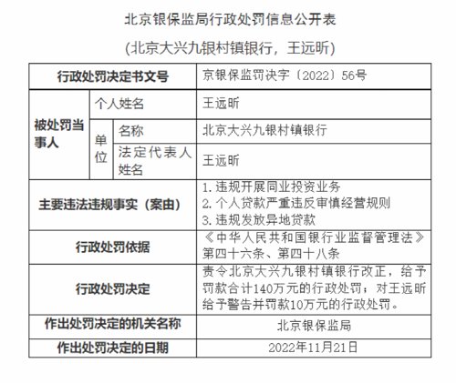 近日,北京大兴九银村镇银行因违规开展同业投资业务、个人贷款严重违反审慎经营规则、违规发放异地贷款等,北京银保监局对其责令改正,给予罚款合计140万元。