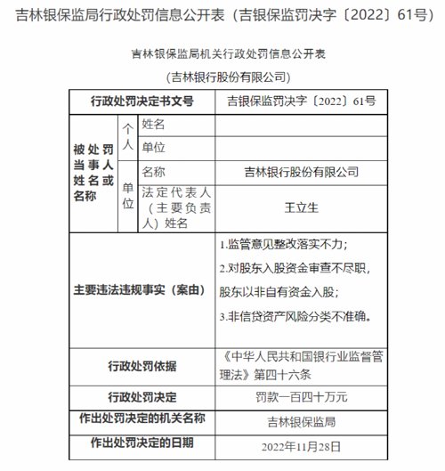 12月1日,吉林银保监局一口气开出6张罚单,吉林银行和一分行合计被罚290万元。据吉银保监罚决字〔2022〕61号行政处罚信息公开表显示,吉林银行股份有限公司因监管意见整改落实不力;对股东入股资金审查不尽职,股东以非自有资金入股;非信贷资产风险分类不准确等三项违法违规事实。依据《中华人民共和国银行业监督管理法》第四十六条,吉林银保监局决定对其处以罚款140万元。该行的三位相关责任人被警告。