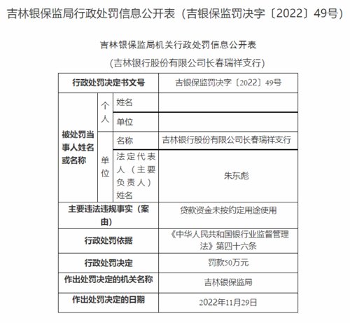 值得注意的是,吉林银行近期频收罚单。在11月30日,吉林银行股份有限公司长春瑞祥支行因贷款资金未按约定用途使用,被处罚款50万元。