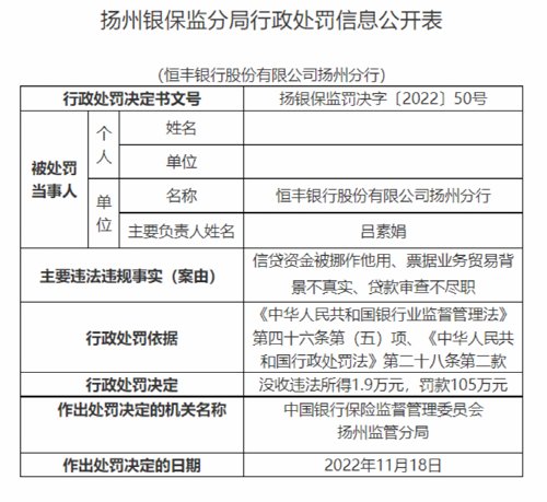 11月29日,恒丰银行股份有限公司扬州分行因信贷资金被挪作他用、票据业务贸易背景不真实、贷款审查不尽职等违法违规事实,依据《中华人民共和国银行业监督管理法》第四十六条第(五)项、《中华人民共和国行政处罚法》第二十八条第二款,银保监会扬州监管分局决定没收违法所得1.9万元,并处罚款105万元。