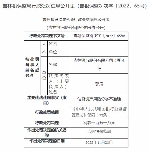 同日披露的吉银保监罚决字〔2022〕65号行政处罚决定书显示,吉林银行股份有限公司长春分行因信贷资产风险分类不准确,吉林银保监局决定对其罚款150万元。