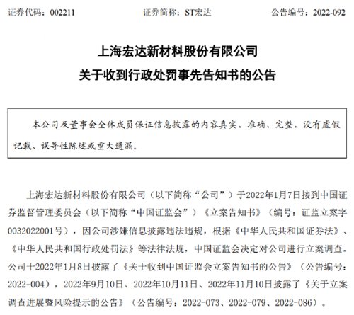 ST宏达12月4日晚公告,公司于12月2日收到证监会出具的《行政处罚事先告知书》。告知书称,经查明,宏达新材涉嫌违法的事实如下: