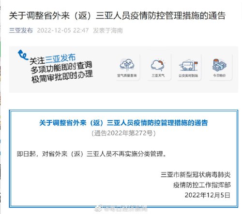 12月5日,三亚市发布关于调整省外来(返)三亚人员疫情防控管理措施的通告:即日起,对省外来(返)三亚人员不再实施分类管理。