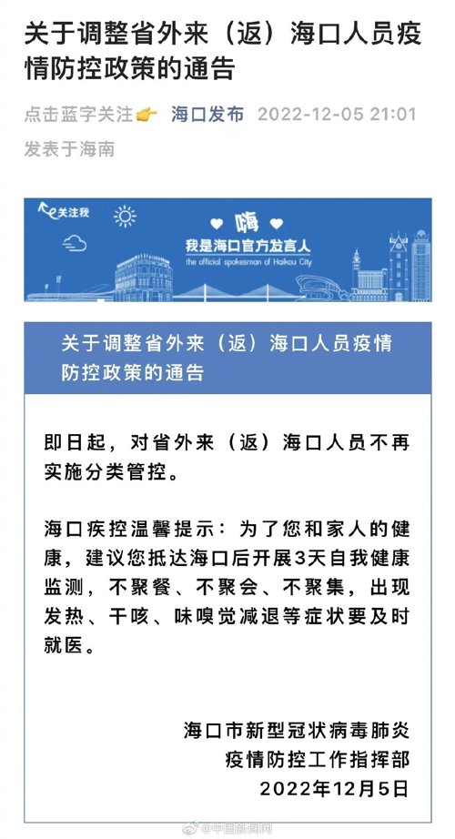 12月5日,海南省海口市调整省外来(返)海口人员疫情防控政策。即日起,对省外来(返)海口人员不再实施分类管控。