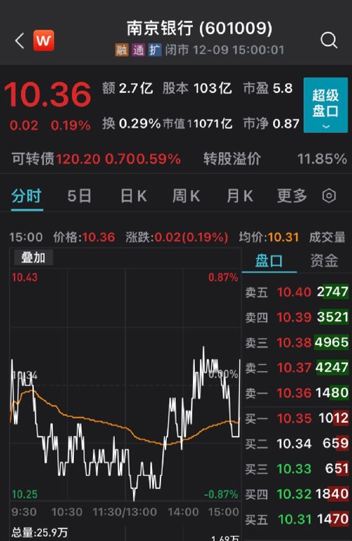 截至12月9日收盘,南京银行股价为10.36元,涨0.19%,市值1071亿元。