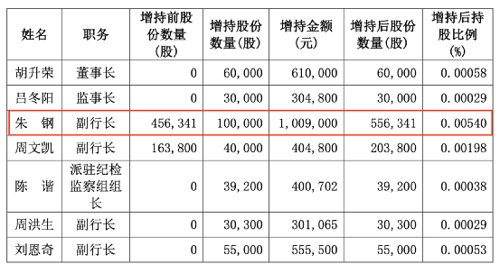 在该行10月10日发布的公告中,时任南京银行副行长的朱钢耗资100.9万元增持10万股,此次增持完成后,朱钢持有南京银行股份55.6万股,持股比例达到0.54%,系该行持股数量最多的高管。