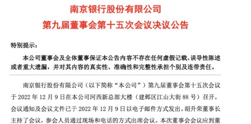 12月9日晚间,南京银行发布《第九届董事会第十五次会议决议公告》,会议决定聘任朱钢为南京银行行长、财务负责人,并提名朱钢为公司第九届董事会董事候选人,但其行长任职资格尚需获得监管部门的核准。