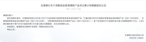 12月6日,交通银行发布公告,交银理财将自2022年12月17日起调整其稳享现金添利理财产品单个投资者在交行渠道的单日累计快赎额度调到1万元,该产品下属3款份额对单个客户在交行渠道共享1万元单日累计快赎额度。