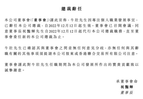 12月14日,恒投证券在港交所公告称,牛壮辞任公司总裁,董事长祝艳辉代行公司总裁职务。