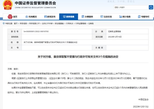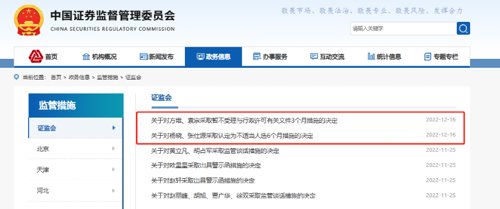 12月16日,证监会官网信息显示,证监会对方维、袁宗采取暂不受理与行政许可有关文件3个月措施的决定,因其保荐项目发行人当年营业利润比上年下滑50%以上;对杨晓、张仕源采取认定为不适当人选6个月措施的决定,因其保荐项目发行人公开发行证券上市当年即亏损。