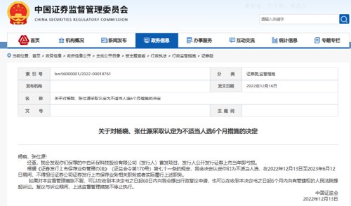 基于此,证监会决定认定杨晓、张仕源为不适当人选,在2022年12月13日至2023年6月12日期间,不得担任证券公司证券发行上市保荐业务相关职务或者实际履行上述职务。