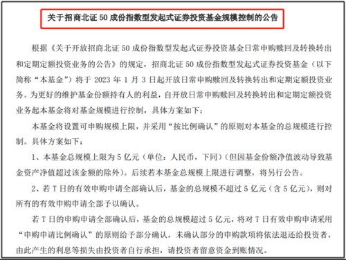 根据该只基金公告,招商北证50成份指数基金总规模上限为5亿元,若在日常申购日出现总规模超过5亿元的情形,将对有效申购申请采取“申购申请比例确认”的原则予以部分确认,未确认部分的申购款项将依法退还给投资者。