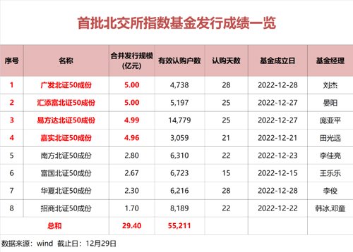 Wind数据显示,截至12月29日,首批8只北证50成份指数基金总募集规模29.4亿元,有效认购户数5.52万户。