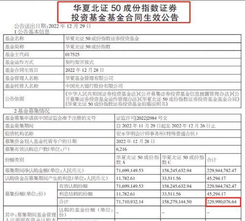 同一天,华夏北证50成份指数基金也宣告成立,该只基金认购户数6216户,认购规模2.3亿元。