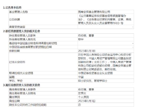 1月4日,国寿安保基金发布高级管理人员变更公告,公司原总经理、董事左季庆因个人原因已于1月3日离任,鄂华于同日履新公司总经理、董事。
