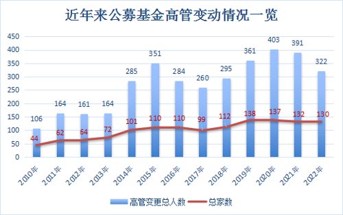 近年来,公募行业高管变更趋于频繁。Wind数据显示,2022年全年共有130家基金公司发生了322人次的高管变更,已经连续第四年超过300人。