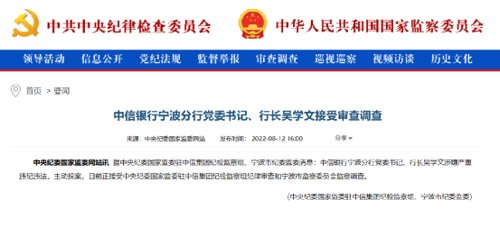 据中央纪委国家监委驻中信集团纪检监察组、宁波市监委消息:日前,经中央纪委国家监委批准,中央纪委国家监委驻中信集团纪检监察组与浙江省宁波市监委对中信银行宁波分行原党委书记、行长吴学文严重违纪违法问题进行了纪律审查和监察调查。