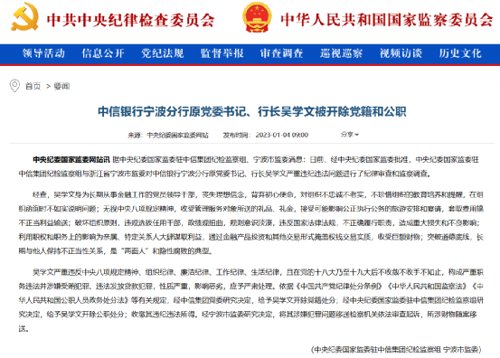 1月4日上午,中央纪委国家监委网站显示,中信银行宁波分行原党委书记、行长吴学文被开除党籍和公职。