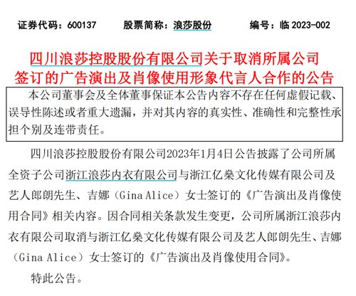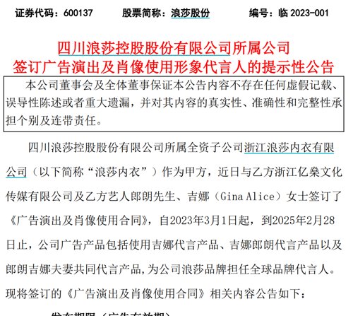 浪莎股份3日晚间曾公告称,浙江浪莎内衣有限公司与浙江亿燊文化传媒有限公司及艺人郎朗先生、吉娜(Gina Alice)女士签订《广告演出及肖像使用合同》。根据原合同内容,自2023年3月1日起,到2025年2月28日止,浪莎内衣公司广告产品包括使用吉娜代言产品、吉娜郎朗代言产品以及郎朗吉娜夫妻共同代言产品,为公司浪莎品牌担任全球品牌代言人
