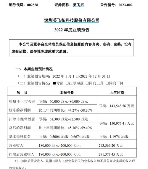 英飞拓1月4日晚间发布业绩预告,预计2022年归母净利亏损6亿元-8亿元,上年同期亏损14.35亿元。报告期内,宏观经济形势下行压力较大,全球地缘环境、新冠疫情影响持续,地方政府投入减缓,社会消费持续下降,公司解决方案、数字运营服务、物联产品等领域市场竞争加剧,项目签约未达预期,对公司经营造成较大影响。