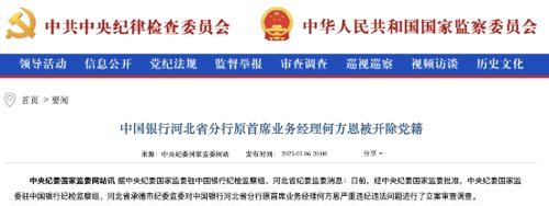 1月6日晚间,中央纪委国家网站讯,日前,经中央纪委国家监委批准,中央纪委国家监委驻中国银行纪检监察组、河北省承德市纪委监委对中国银行河北省分行原首席业务经理何方恩严重违纪违法问题进行了立案审查调查。