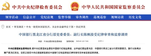 就在1月2日,还有一则中国银行系统内高管被查的消息。据中央纪委国家监委驻中国银行纪检监察组、吉林省纪委监委消息,中国银行黑龙江省分行原党委委员、副行长陈枫涉嫌严重违纪违法,目前正接受中央纪委国家监委驻中国银行纪检监察组纪律审查和吉林省监委监察调查。