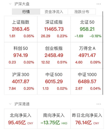 截止收盘沪指涨0.05%,深成指涨0.23%,创业板指涨0.51%。两市共2259只个股上涨,25387只个股下跌,北向资金净买入95亿元。