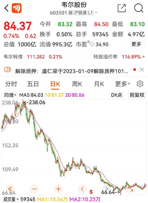 韦尔股份二级市场表现实际上已经反应了业绩下滑预期,其股价从去年年初的229.09元/股,回落至去年年底的77.09元/股,其市值缩水幅度66.35%,接近七成。截至1月13日收盘,韦尔股份市值为1000亿元。