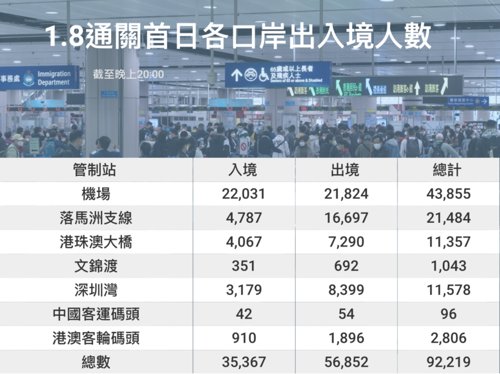 香港入境处表示截至8日晚上8时,有约4.5万人经其中五个口岸往返两地。当中出境人数增至约3.3万人,五个口岸当中仍然是最多人经落马洲支线出入境香港,有16697人经落马洲支线出境,入境则有4787人,另外深圳湾及港珠澳大桥亦分别有8399人及7290人出境。
