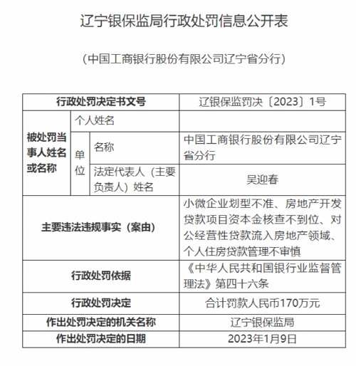 除此之外,辽宁银保监局还对工商银行辽宁省分行给予处罚,罚款金额高达170万元!