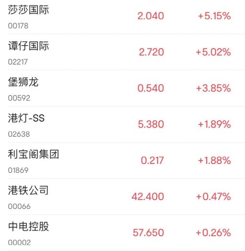 香港本地零售股闻讯走强,莎莎国际拉升涨超5%,股价创18个月新高价,谭仔国际升超5%,堡狮龙涨3.85%,六福集团、周生生、佐丹奴国际均涨近3%,李嘉诚家族旗下港灯-SS涨近2%。