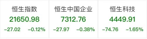 截至收盘,恒生指数收跌0.12%,报21650.98点;恒生科技指数跌1.65%,报4449.91点;恒生国企指数跌0.38%,报7312.76点。南向交易今日暂停,大市成交仅925.97亿港元。
