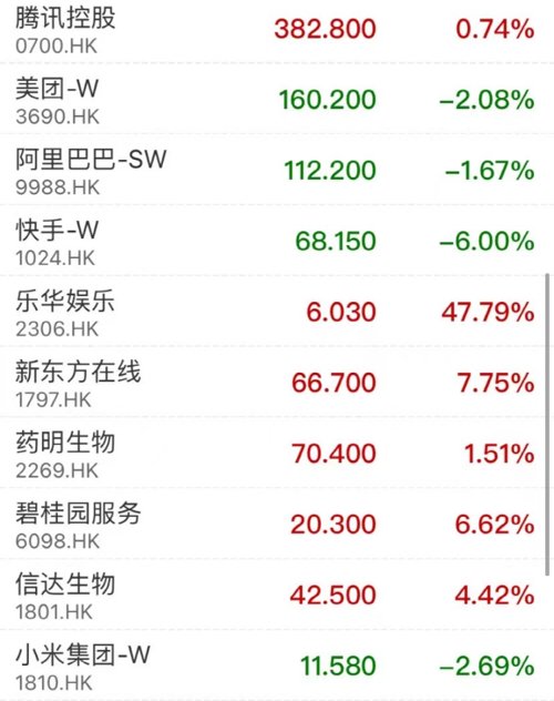 盘面上,大型科网股多数下挫,遭董事长减持套现,快手跌6%,网易、哔哩哔哩跌超3%,百度、蔚来跌近3%,阿里巴巴跌近2%,但港股“股王”腾讯逆市收涨0.74%。