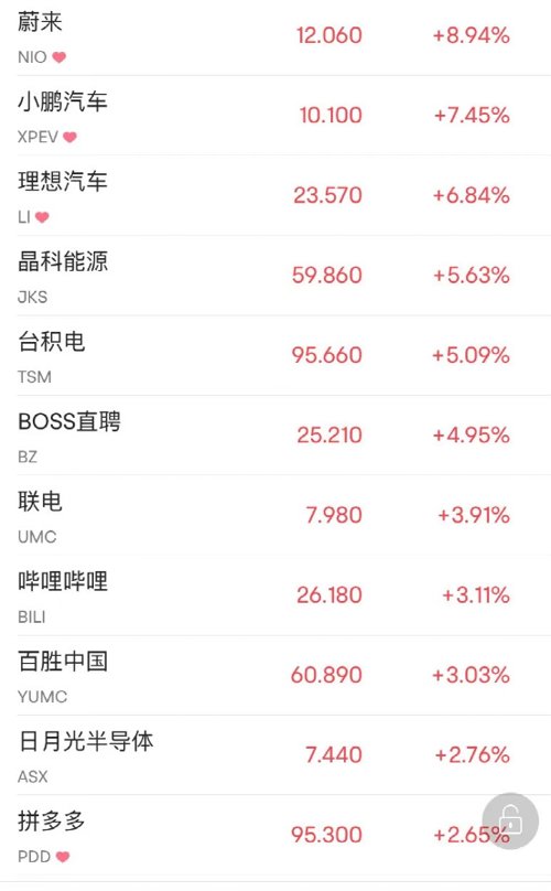 中概股兔年开门红,多只热门中概股上涨,“新能源车三巨头”蔚来涨近9%,小鹏汽车涨超7%,理想汽车涨近7%。