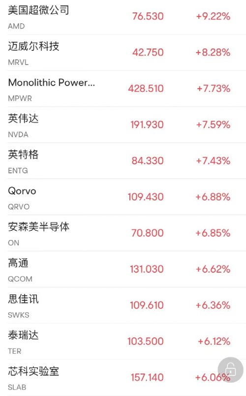 芯片股强势,费城半导体指数涨逾5%。芯片巨头英伟达收涨7.59%,超威半导体AMD涨超9%。