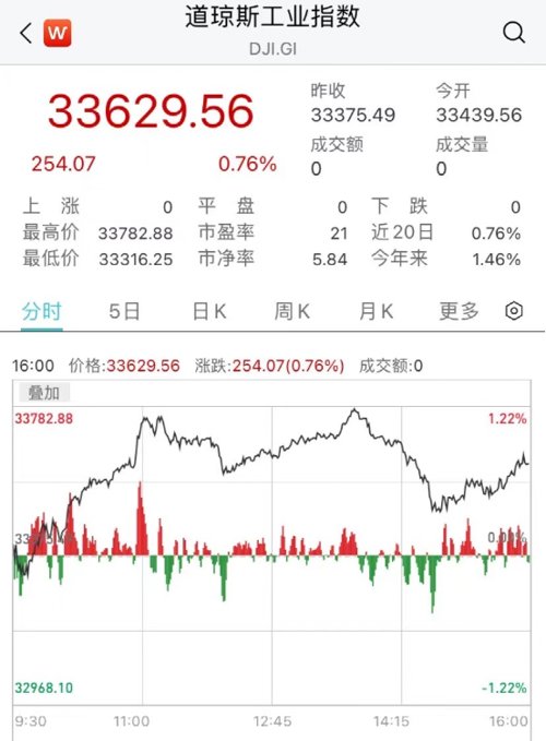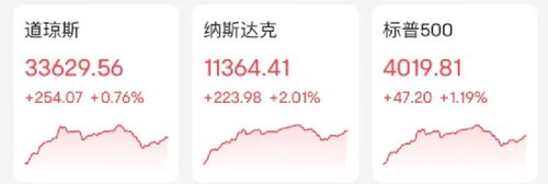 截至收盘,道琼斯指数收涨0.76%,涨254.07点,报33629.56点;标普500指数涨1.19%,报4019.81点;纳斯达克综合指数涨2.01%,报11364.41点。标普大盘、纳指均创七周新高。