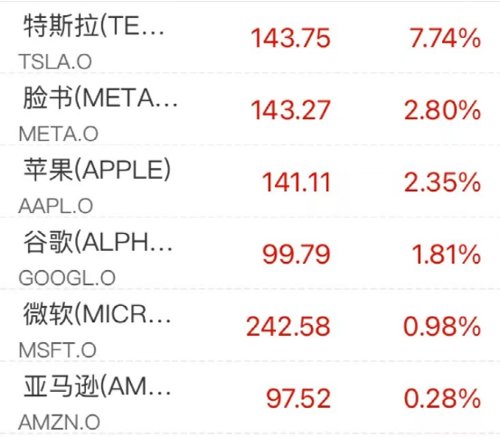 龙头科技股也强势大涨。苹果涨2.35%,亚马逊涨0.28%,奈飞涨4.36%,谷歌涨1.81%,脸书涨2.8%,微软涨0.98%。