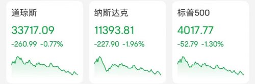 截至收盘,道琼斯指数跌0.77%,跌超260点,报33717.09点;标普500指数跌1.30%,报4017.77点;纳斯达克指数跌1.96%,报11393.81点。