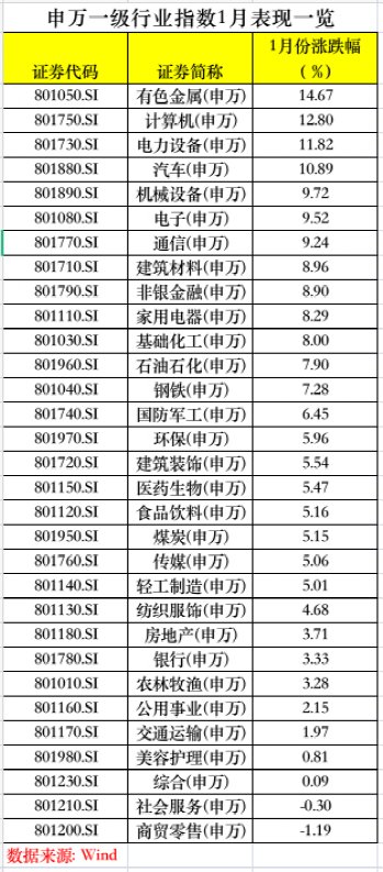 A股1月行情已收官。1月份,A股市场震荡反弹,上证指数、深证成指、创业板指分别累计上涨5.39%、8.94%、9.97%。1月涨幅最大的有色金属行业大涨14.67%。