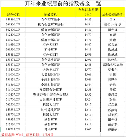 1月指数基金最高赚15%,有色、金融科技指数霸屏涨幅排行榜