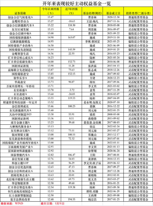 1月份伴随着市场回暖,公募权益类基金整体净值回血,超240只主动权益基金收益率涨超10%,年内收益在13%以上也有近40只,其中大部分重仓了新能源、有色金属、信创板块相关个股。